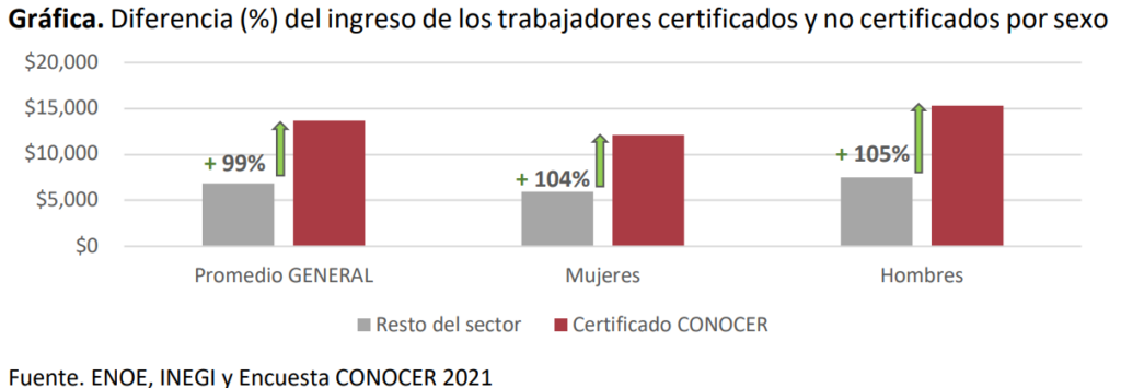 Las personas certificadas ante el CONOCER reciben un ingreso promedio de $13,667 pesos mensuales, casi el doble que quienes no están certificados ($6,858).